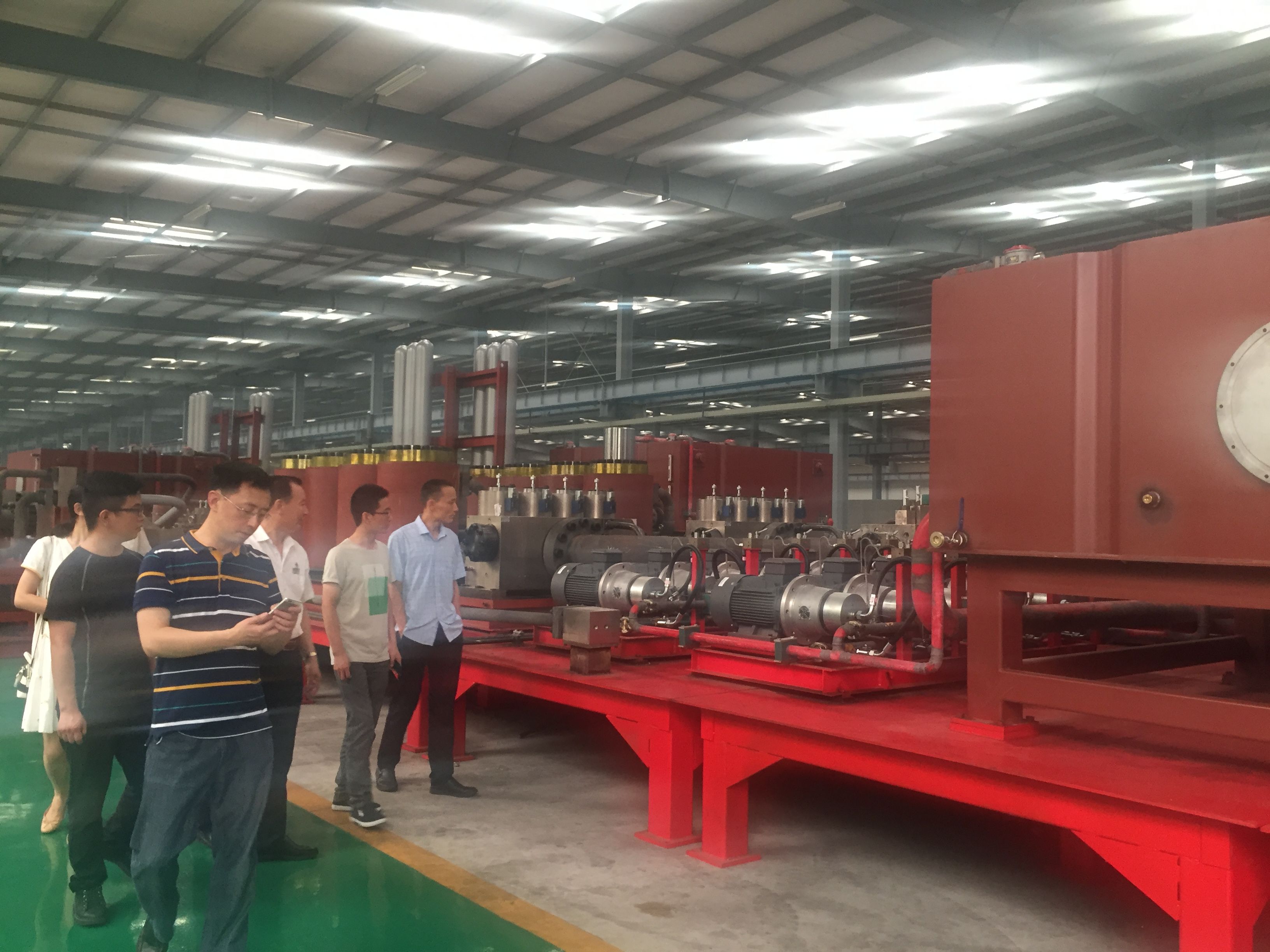 2018年7月11日,中国二重万航模锻有限责任公司模锻厂厂长李蓬川、副厂长张田民、总工程师陈先国一行,在公司董事长王振华,副总经理沈先锋等的陪同下,莅临泰丰智能工业园,就共同承担的 “中国制造2025”2015年工业转型升级强基工程项目——超高压大流量电流比例伺服二通插装阀研发及产业化项目(简称强基项目)实施情况进行工作勘查。